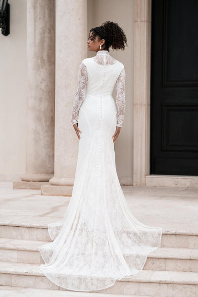 A true expression of full-coverage elegance, this sheath gown is designed in delicate all over Chantilly lace. The high neckline and long sleeves offer a timeless, refined silhouette, while the fitted shape glides softly over the frame. A chapel-length train and covered buttons down the back complete the look with classic, graceful detail.