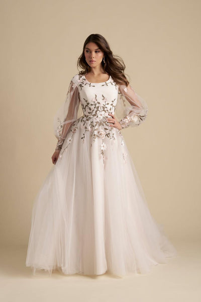 Whimsical yet grounded, this modest ballgown features boldly organic lace appliques that climb from the bodice to the billowing tulle sleeves. A scoop neckline softens the silhouette, while the full tulle skirt adds lightness and movement. Also available in all ivory, this gown offers a fresh, free-spirited take on traditional bridal style.