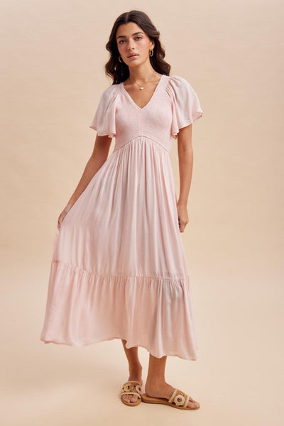 FEATURES: SMOCKED FRONT AND BACK BODICE, FLUTTER SLEEVES, FLOUNCED HEM, AND DOUBLE LINED WITH OUR SILKY MODAL FABRIC.