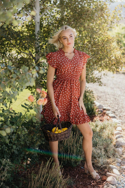 Short dress with ruffle hem, natural waist, v neckline and short flutter sleeves.