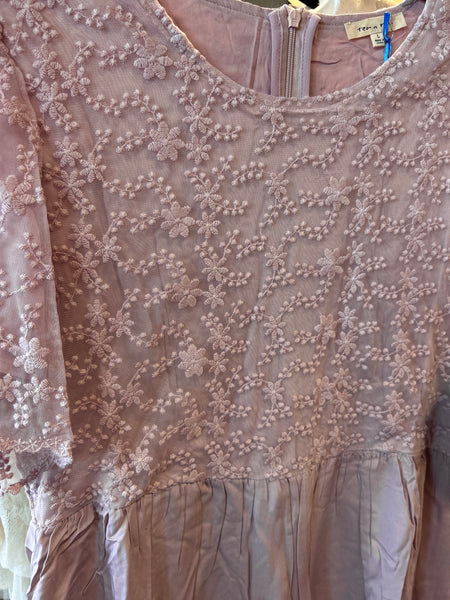 Floral Lace Petal Sleeve Knee Length Dress Lace wide sleeves Side pocket Round neck Gathered at waist Voluminous bottom Made in USAPhotographed in Coral Pink
