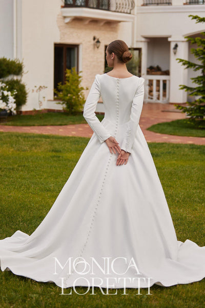 A refined gown with a structured bodice, long sleeves, and a sweeping A-line skirt. The back features a graceful row of buttons, enhancing its timeless elegance.